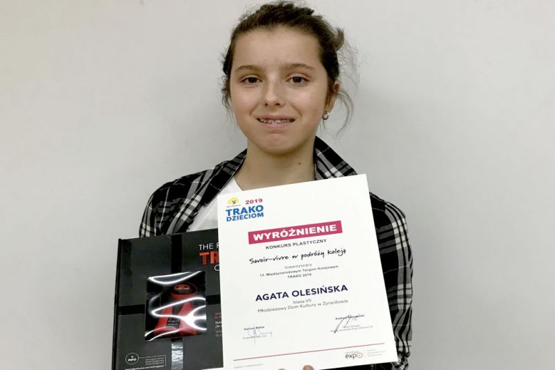 Wychowanki Dziecięcej Akademii Plastycznej działającej w Młodzieżowym Domu Kultury w Żyrardowie zostały uhonorowane trzema wyróżnieniami w dwóch ogólnopolskich konkursach plastycznych. W pierwszym z nich, którego tematem był ,,Savoir – vivre w podróży koleją” wyróżnienie przyznano Agacie Olesińskiej, której nauczycielem jest Bożena Liszewska. Konkurs, którego celem była promocja kulturalnych zachowań w trakcie podróży koleją, został zorganizowany jako impreza towarzysząca 13. Międzynarodowym Targom Kolejowym TRAKO 2019 w Gdyni.