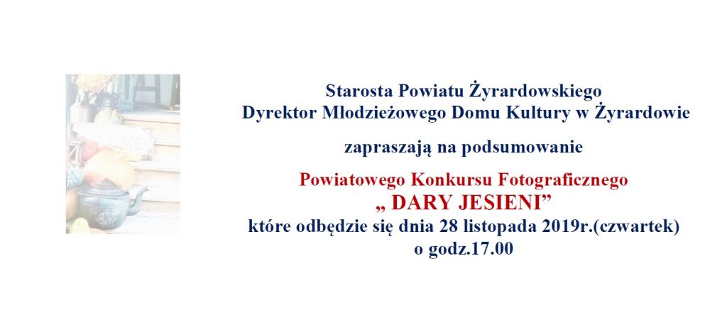 Młodzieżowy Dom Kultury zaprasza na uroczyste podsumowanie Powiatowego Konkursu Fotograficznego „Dary jesieni”. Podsumowanie odbędzie się w dniu 28 listopada 2019 roku (czwartek) o godz.17.00. w Młodzieżowym Domu Kultury w Żyrardowie.