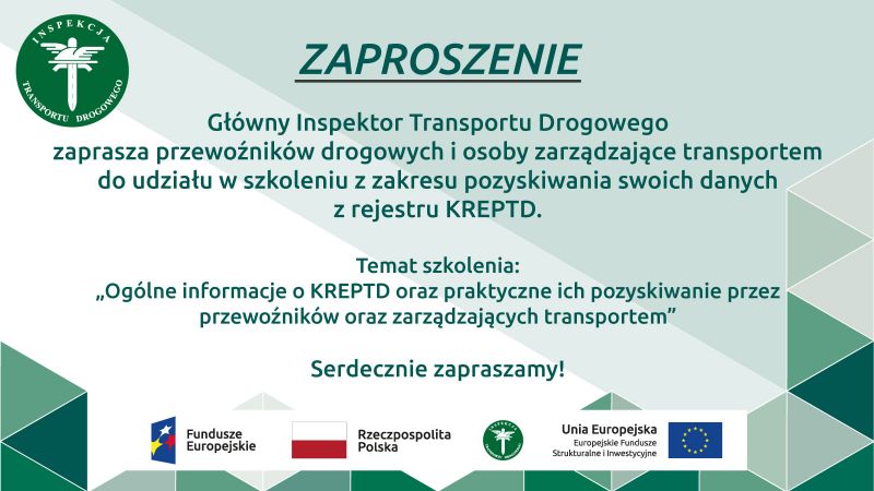 Główny Inspektor Transportu Drogowego zaprasza przewoźników drogowych i osoby zarządzające transportem do udziału w szkoleniu z zakresu pozyskiwania swoich danych z rejestru KREPTD. Temat szkolenia to: „Ogólne informacje o KREPTD oraz praktyczne ich pozyskiwanie przez przewoźników oraz zarządzających transportem”.